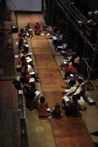 Do bar com toldos negros que abriga vampiros de diversas tribos até as dez da manhã, penso em outro ambiente, agora alto, claro, luminoso e ainda assim medieval que nos remete aos tempos em que se encenava Sheakespeare, em suas primeiras montagens, trata-se de um teatro, o Teatro Oficina. Com uma estrutura que disponibiliza mais de três andares fiquei maravilhado imaginando como eles utilizavam aquela proposta, pois ainda não tive o privilégio de assistir nenhuma montagem ali. Minha visita foi retribuição a um convite para um encontro descontraído durante o dia. Naquela fria tarde de domingo de caldo e cachaça conheci um grupo muito bonito de atores e produtores, composto por artistas jovens, visivelmente engajados, que tem como mestre o genial Zé Celso Martinez Corrêa. Gostei do clima e sai satisfeito por ter adentrado a famosa obra arquitetônica de Lina Bo Bardi.